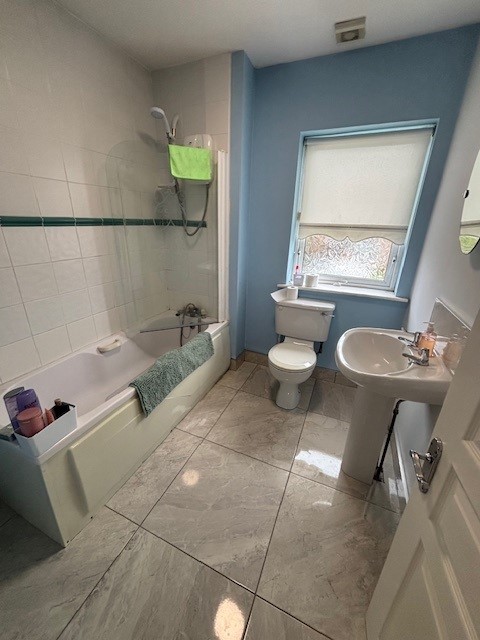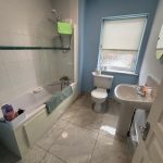 W.c, w.h.b, bath with telephone shower and Mira Elite shower, part wall and floor tiling, shaving light.