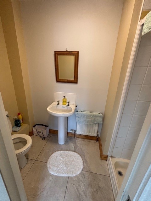 W.c, w.h.b, shower unit, part wall and floor tiling.