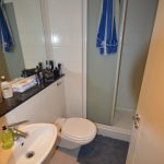 W.c, w.h.b, shower unit, part wall and floor tiling, recess lighting.