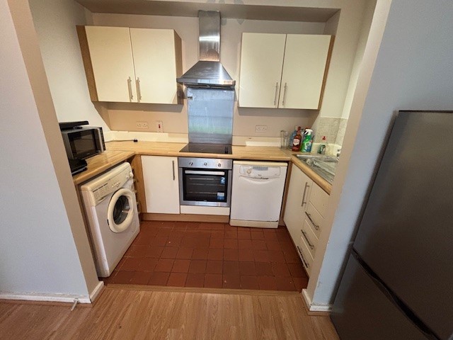 Excellent range of wall and floor units, hob & oven, extractor fan, plumbed for dishwasher and washing machine, part wall and part floor tiling, laminate flooring, door to rear.