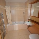 W.c, w.h.b, bath with telephone shower, fully tiled walls and flooring, shelving, recess lighting, heated towel rail.