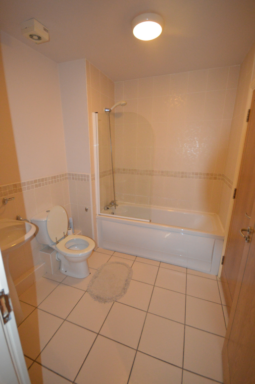 W.c, w.h.b, bath with telephone shower, part wall and floor tiling.